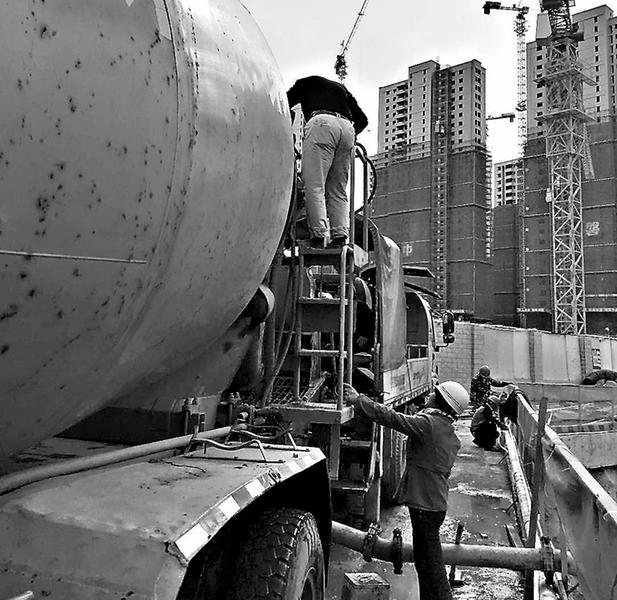 外检工的辛勤付出和敬业精神得到了施工方的充分肯定,同时也为龙岩混凝土公司的工地服务和质量管理树立了良好形象。这一夜,他们从晚上7点一直干到第二天的早上8点,员工们度过了一个不眠之夜。(李晓添摄影报道)外检工爬上罐车检测混凝土质量。