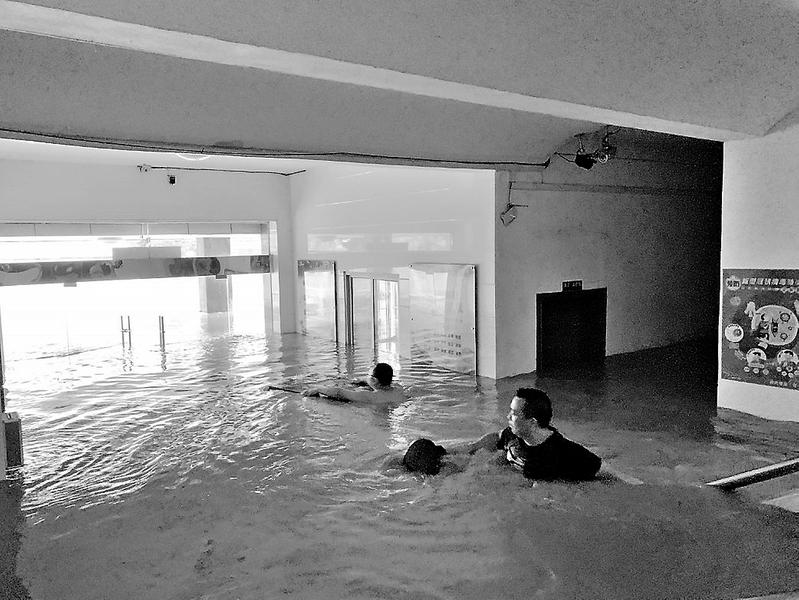 图为职工正在淌水“抢救”被洪水冲走的办公桌椅。