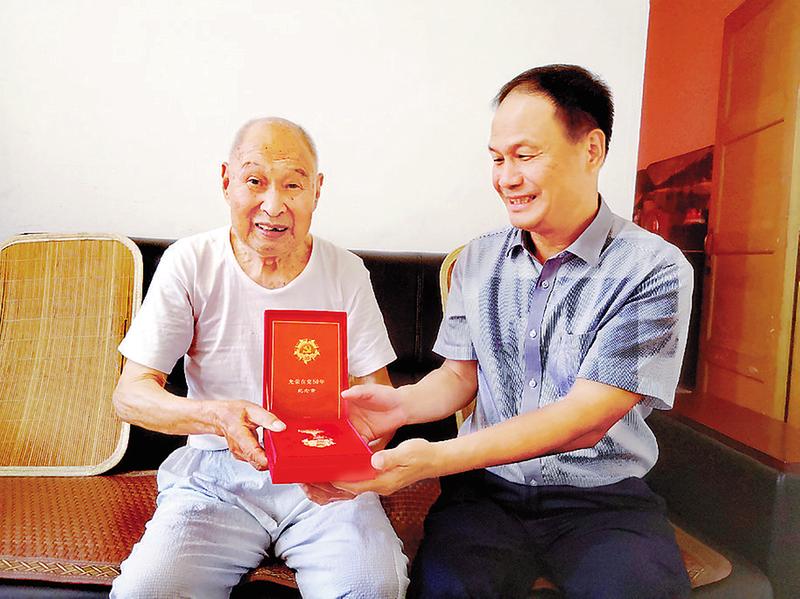 ⑨“七一”前夕,永安煤业公司领导分赴各地为老党员颁发“光荣在党50年”纪念章。图为该公司党委书记、董事长陈荣万为老党员林以晋颁发“光荣在党50年”纪念章。 (肖毓庆 陈吉烺 摄影报道)