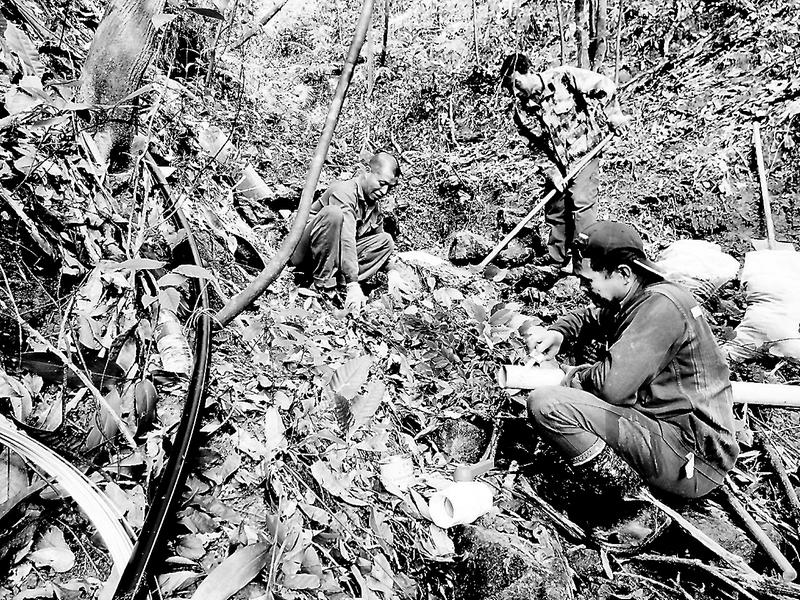 近日,由于天气炎热干燥,漳平煤业物业管理开发公司组织职工为文宾山复垦区十多亩旱地农作物,安装引水灌溉使用的管路。(沈建霞摄)