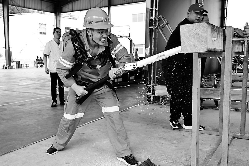 为了练就过硬本领,苏荣桂的日常训练近乎“残酷”。在浓烟弥漫、50℃高温的模拟环境中,他佩戴氧气呼吸器完成锯木头、打点柱、扛沙包等高强度科目;每天负重20公斤跑2000米,每周5000米越野跑更是雷打不动。他甚至主动加码,将检力器重量增至30公斤,负重背心里多塞两块铁片,冲坡跑比别人多跑两三趟。同事们常说:“小苏那训练服,每天都能拧出水来。”