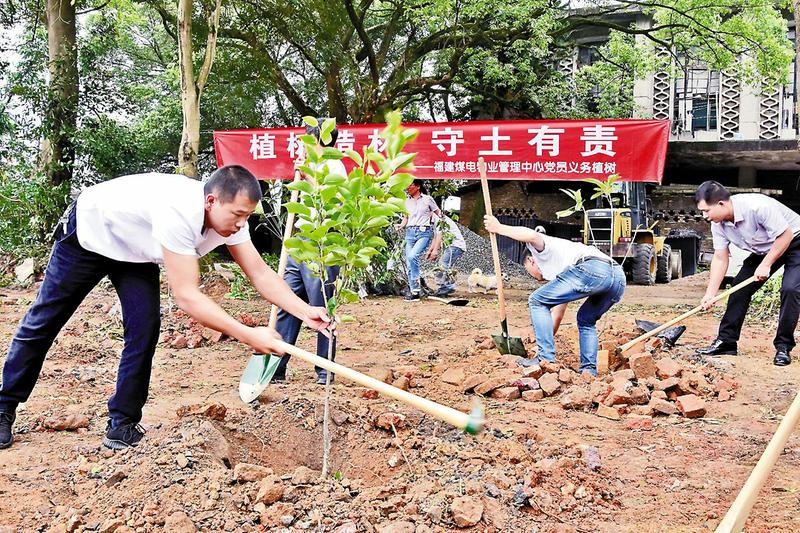 矿井去产能闭坑后,当地个别村民不时在矿井周边“圈地”。为确保“守土责”,五月四日,福建煤电公司物业中心党支部组织二十多名党员到培丰矿守处开展“植树造林守土有责”主题活动,现场种植枇杷、柠檬和蜜雪梨等果一百五十株。(郑延玲摄)