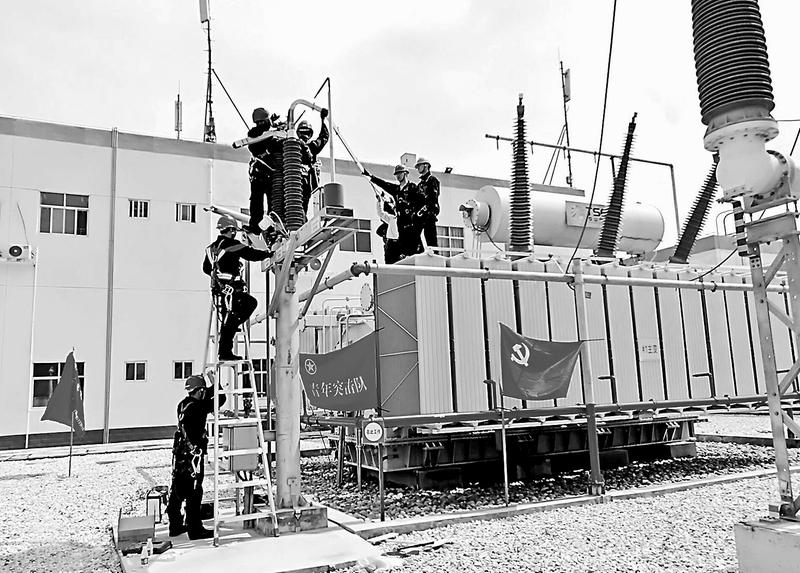 福能新能源公司团委认真学习宣贯共青团十八大精神,积极引导广大团员青年不忘跟党初心,牢记青春使命,扎根一线,充分发挥专业优势,为新能源事业贡献力量,展示才华。图为6月27日,该公司党员、团员青年突击队在漳州省山升压站年检的镜头。