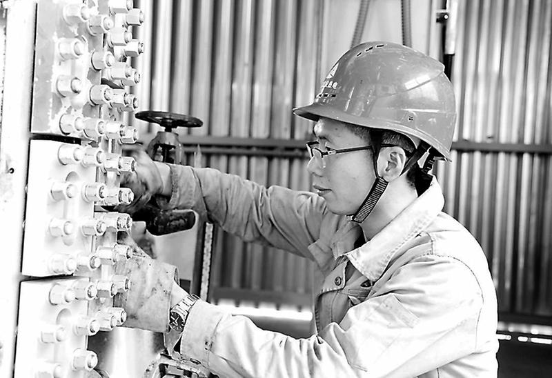(吴仙和摄影报道)曾再兴正在对锅炉辅助系统进行检修