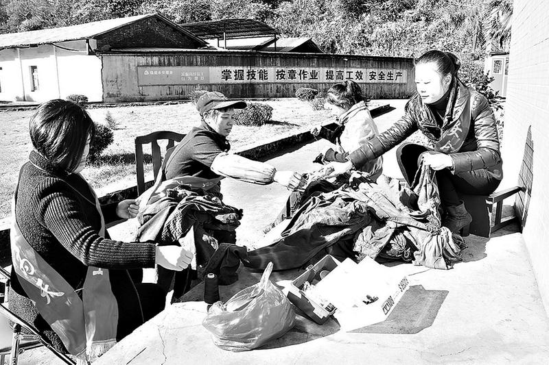 郑艳冬((右一右一))为职工缝补衣物 “天哪,这不会冻僵吧?手都拿不出来呀,怎么缝补?协管员黄珍妮颤抖地跟随在女工主任郑艳冬身后,不断地抱怨着。12月15日9时许,郑艳冬组织协管员们到井口帮助矿工缝补破损的衣物,井口位于山头之上,气温比生活区冷了许多,山林是一片片白茫茫的,尽管穿着厚实的防寒衣装,但有的协管员还是觉得寒气逼人,身子禁不住地颤抖着,牙齿上下碰撞发出“咯咯”的撞击声。