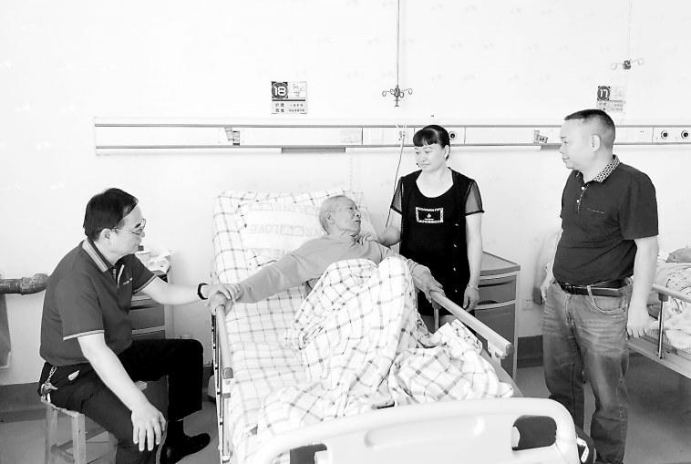 “不忘学习、关心国家大事、关注公司的发展事务”,也是党支部党员们对周伙莲的总体评价。在龙岩市博爱医院病房,周伙莲的这种爱国爱党的热情深深地感染着大家。(林秀龙摄影报道)图为福建煤电公司组织人员看望住院的周伙莲。
