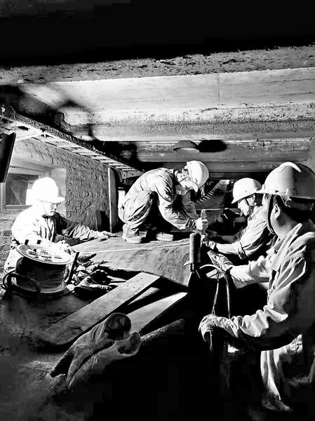 皮带胶接工作说起来简单,做起来并非易事,特别是这类10.127皮带,皮带廊内宽不足3米,高只有2米,又有30度夹角的斜坡。笔者在现场看到,每一位“参战”员工额头上晶莹的汗珠不断滑落,顺着沾满煤灰的脸颊流进脖颈,湿透上衣。在皮带架上正半跪、猫腰剥皮带头的孙苏建对笔者说:“今天大家都疲惫不堪,稍不留意还会四处‘碰壁’,个个还弄得像个‘煤黑子’。”笔者一边听着说孙师傅的诉说,一边掏出手机抬头给他们拍照时,头上的安全帽“咚”的一声撞在皮带廊的横梁上。