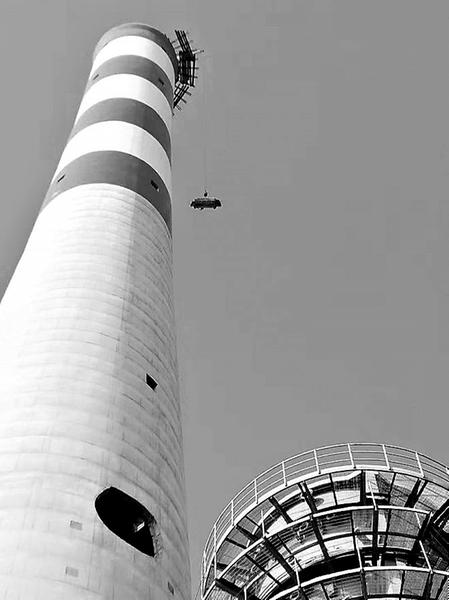 10月份,烟囱完成了外筒航标漆施工的粉刷,紧接着外部作业就来到了最后、最高、最险峻的一环:烟囱顶部平台整体拆除。150米高空,顶部平台完全凸出在烟囱的筒体外部,由中心向外辐射着84根槽钢,采用焊接或螺栓固定、连接,这些14号规格的槽钢,长三四米,每根约84公斤,总重量达7吨多。槽钢上面环形铺设着260多块踏板,平台下面还架设有双层的吊式平台,铺设330根踏板。所有这些高悬在150米烟囱顶部的材料都要由施工人员小心翼翼地一一悬挂固定、拆卸、打捆,用卷扬机吊起落到地面。顶部8名作业人员登上烟囱,系好防坠器、安全带,一干就是四五个小时,一天只能下来两次。这完全是一场对作业人员高超的技能、超强的意志、稳定的心理素质的严峻考验。