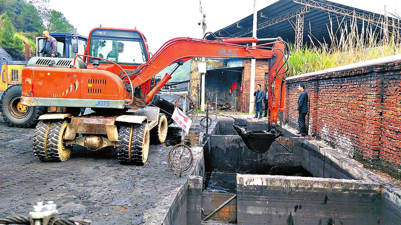 漳平煤业公司发运站为确保春节期间煤场不出现因暴雨造成的环保事故,1月15日,组织人员和机械设备对站区沉淀池、排水管道、煤炭堆场进行治理整顿。图为小型挖掘机清理回收三级排污沉淀池及循环池煤泥。(彭元亮摄)