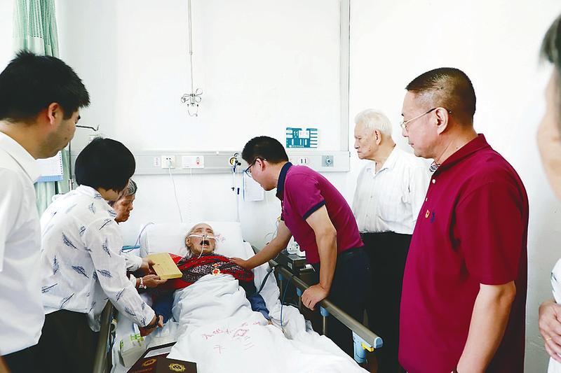 图为梁晓良等人慰问陈广刘。 9月24日上午,福建省直机关医院内,新中国成立前参加革命工作的老战士老同志、98岁的老党员陈广刘两周前因肺部出现炎症住院治疗。