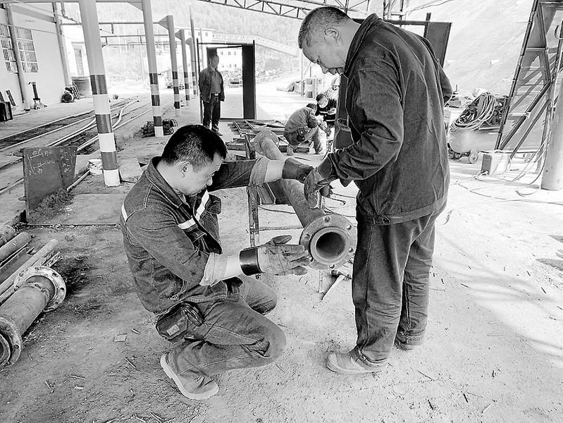 漳平煤业公司箭竹坪煤矿专门组织人员对井下废旧物资进行回收,对各项废旧物资进行再加工,有效地减少了成本投入,促进了经济效益提升。图为该矿机电人员利用废旧物资加工井下管路。(卢景喆 摄影报道)