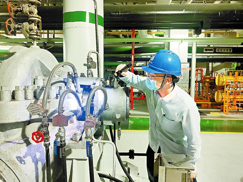 为全力保障疫情期间机组的安全生产运行,肩负起能源保供的社会责任,鸿山热电公司设备维护部安排专人驻守现场对设备开展特巡特护。图为近日,该公司汽机专业点检人员对2B汽前泵非驱动端渗水情况进行仔细排查。(陈彦摄影报道)