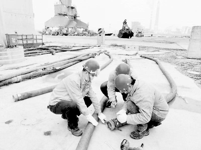 新材公司鸿山分公司全体职工始终绷紧疫情防控和保安全促销售这两根弦。疫情期间船运17艘,全面完成了预期销售计划指标。图为近日,该公司职工对磨损严重的输灰管路进行包扎止漏,确保船灰销售顺利进行。