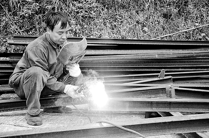 “五一”假期,永安煤业公司池坪芦坑煤矿职工尽心尽职坚守在各自的岗位上。图为5月2日,该矿职工正在焊接井下巷道支护使用的棚梁。