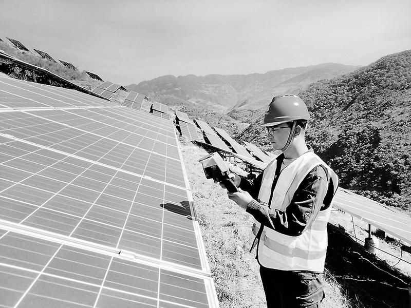 近日,福能新能源公司云南省保山市管粮山光伏电站运维人员对光伏区光伏组件、支架、汇流箱等设备进行逐一排查,发现缺陷及时记录、处理,确保每一部分发电设备都正常运行。图为运维人员正在用红外热成像仪对光伏组件进行检测。(杨承明摄)