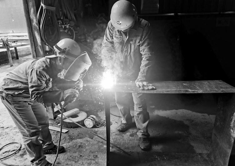 (陈娟摄影报道)图为黄慧敏(左)在焊接工作中