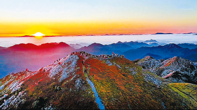 天未破晓,我们便已踏着寒霜拾级而上,山风裹挟着草木的清冽扑面而来,寒气钻进衣领冻得人瑟瑟发抖。当我们登到山顶观景台时,那里早已聚满了许多同样慕名而来的人,大家静静伫立,都在等待着天际的第一缕光芒。渐渐地东方泛起一抹鱼肚白,云层间渗出金芒,紧接着万道霞光破云而出,如金箭刺破苍穹,倾洒在翻涌的云海之上,刹那间大丰山仿佛被托举于鎏金仙境之中。观景台上快门声此起彼伏,大家都争分夺秒地想要捕捉雾凇与云海的每一帧变化,每个人的脸上都写满了惊叹。
