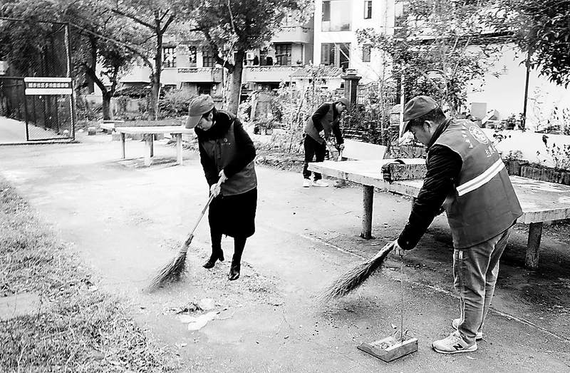 1月12日,永安煤业公司上京供电所志愿者到永安市燕南街道龙岭社区开展“共建文明永安,你我共同参与”志愿活动。图为志愿者在社区体育场打扫环境卫生。 (郑春生 摄)